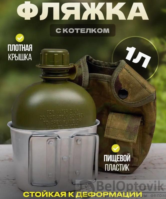 Купить Фляжка походная для воды с котелком 2в1 в чехле / Фляжка 1 л., котелок 0.5л. на нашем сайте можно ОПТОМ от 20 шт. или меньше, если Вы покупаете у нас и другие товары (сборный заказ).