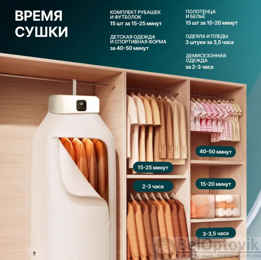 Элегантный дизайн и крепкий чехол делают этот товар стильным и удобным. Не теряйте время на ожидание, используйте электрическую сушилку для белья и наслаждайтесь сухой и свежей одеждой каждый день! Портативная сушильная камера поможет вам в защите от бактерий, насекомых и клещей благодаря ультрафиолетовому облечению одежды. Также нашу сушилку можно использовать при маленьких детях, ведь она безопасна, а ее мощных мотор бесшумный.