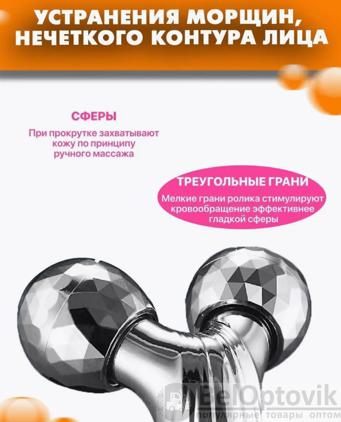 3D Массажер представляет собой небольшой прибор в виде ручки, на основании которой закреплены два ролика многогранной формы.