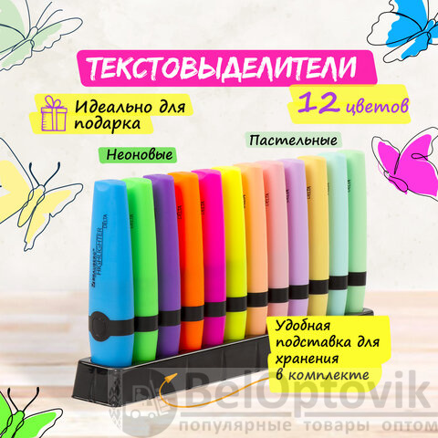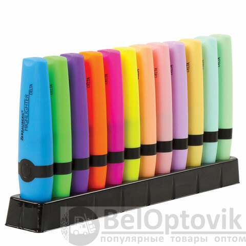 Набор текстовыделителей 12 ЦВЕТОВ на подставке, BRAUBERG "DELTA", линия 1-5 мм, 151737