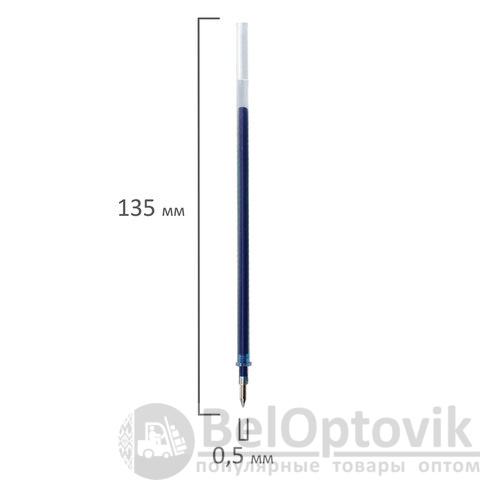 Длина стержня составляет 135 мм. Диаметр пишущего узла 0,5 мм создает тонкую линию письма, равную 0,35 мм. Имеет евронаконечник. Цвет чернил - синий.