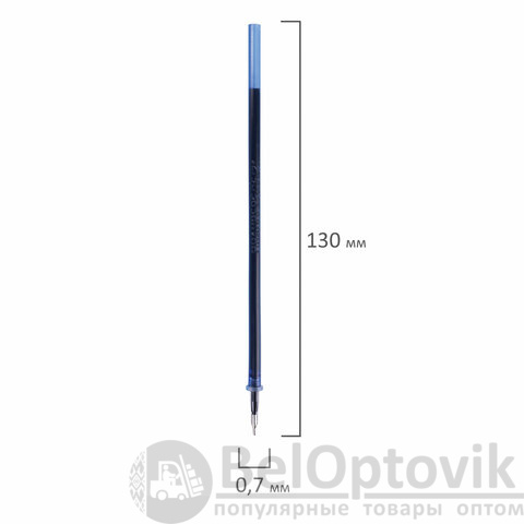 Длина стержня составляет 130 мм. Диаметр пишущего узла 0,7 мм создает ровную линию письма, равную 0,35 мм. Имеет игольчатый наконечник. Цвет чернил - синий.
