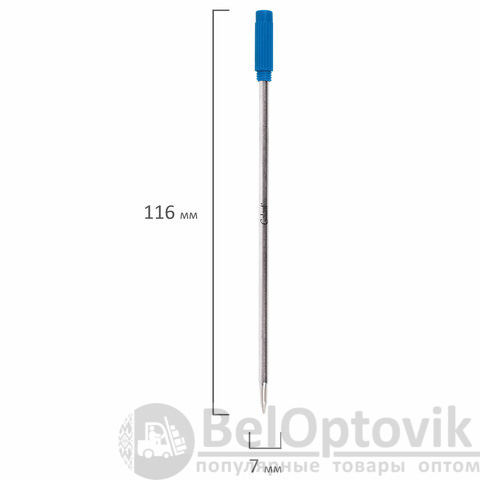 Длина металлического стержня составляет 116 мм. Диаметр пишущего узла 0,7 мм создает ровную линию письма, равную 0,35 мм. Имеет стандартный наконечник. Цвет чернил - синий. Поставляется в блистере.