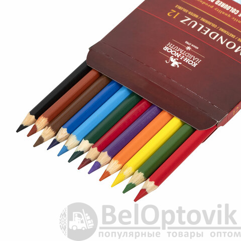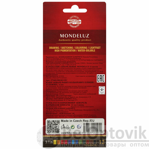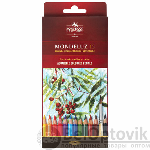 Карандаши цветные акварельные художественные KOH-I-NOOR "Mondeluz", 12 цветов, 3,8 мм, заточенные, европодвес, 3716/12, 3716012001KSRU