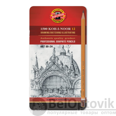 Карандаши чернографитные KOH-I-NOOR, НАБОР 12 шт., "Art", 8В-2H, без резинки, металлическая коробка, 1502012008PL