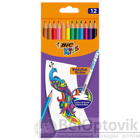Карандаши цветные стираемые с ластиком BIC "Kids Evolution Illusion", 12 цветов, круглые, 987868