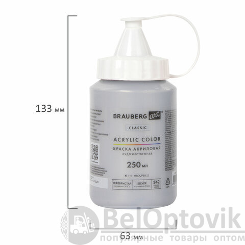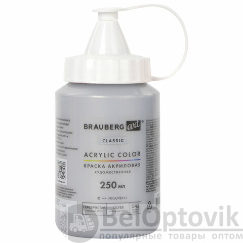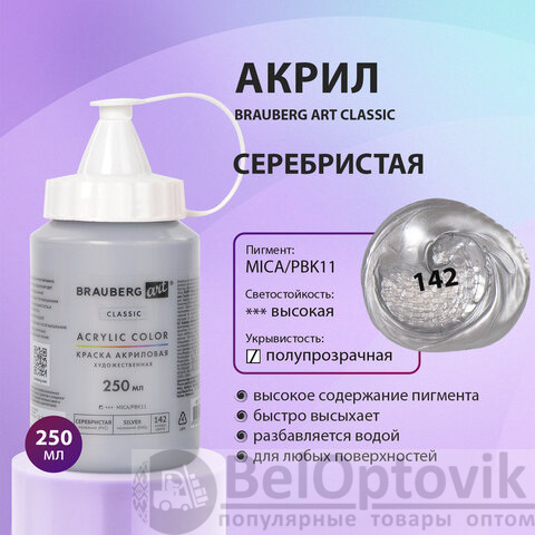 Краска акриловая художественная BRAUBERG ART CLASSIC, флакон 250 мл, СЕРЕБРИСТАЯ, 191715