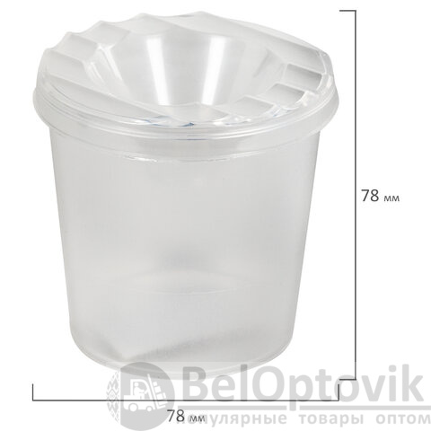 Стакан выполнен из прочного пластика. Линия на прозрачном корпусе указывает на максимально возможный уровень наполнения. Специальная форма крышки стакана исключает возможность вытекания воды. На крышке имеются углубления для размещения кисточек. Полный объем - 210 мл. Объем до уровня наполнения - 75 мл.