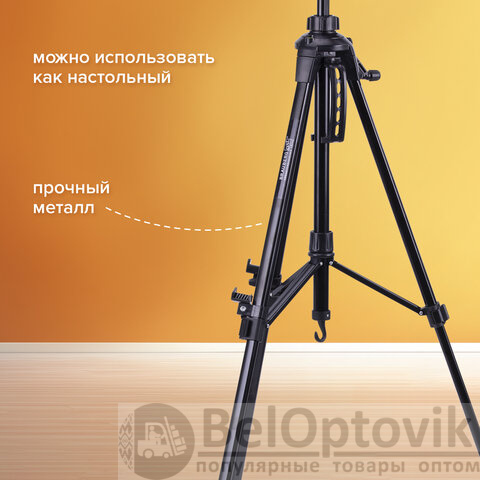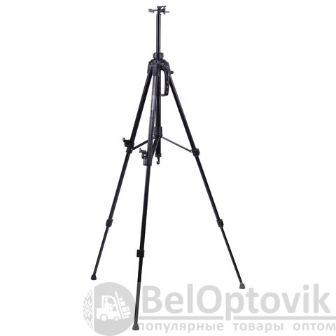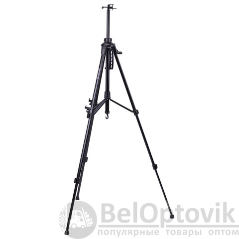 Мольберт оснащен крючком, на который можно подвесить ведерко с краской или груз для придания устойчивости. Выдвижные ножки оснащены зажимами-клипсами, как у современных фотоштативов, благодаря чему установка мольберта производится очень быстро. Выполнен из устойчивого к коррозии металла, который обеспечивает легкость и прочность изделия. Максимальная высота размещаемого холста – 73 см.