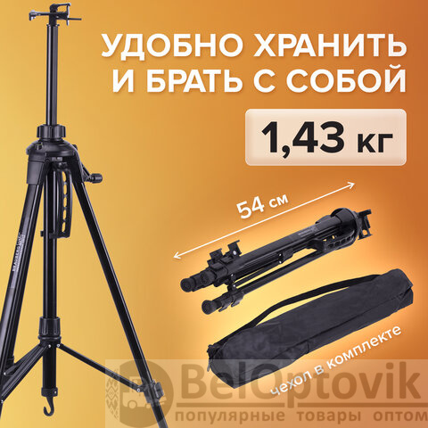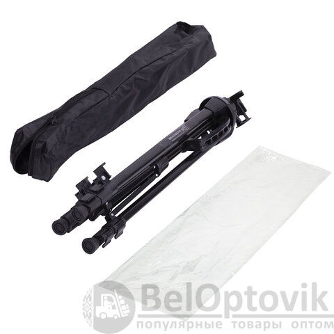 Поставляется в комплекте с черным чехлом на молнии и ремешком, обеспечивающим удобство транспортировки при выездных работах. Легко складывается, удобен для переноски. Максимальный размер в рабочем состоянии – 92х156х80 см. Минимальный размер в рабочем состоянии – 39x54x39 см. Вес – 1,42 кг. Упакован в пакет и белую коробку.