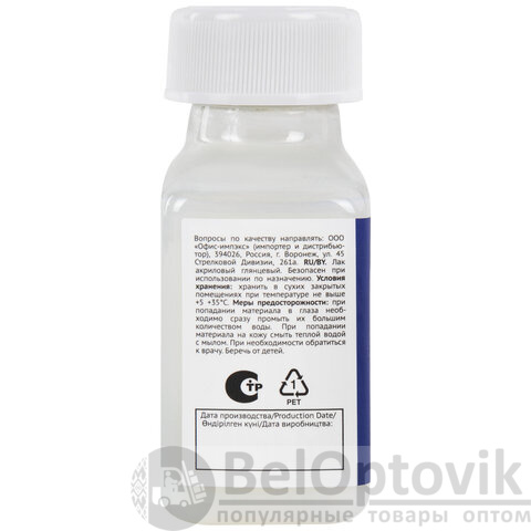 Подходит для покрытия законченных и высохших картин, а также заготовок из дерева, пластика, глины, бетона, гипса и др. Образует прочную пленку, устойчивую к внешним воздействиям, придает поверхности высокие декоративные характеристики, долговечность, водоотталкивающую способность в сочетании с отличной паропроницаемостью. Объем - 100 мл. Упаковка - пластиковая бутылка с плотно закручивающейся крышкой в пакете.