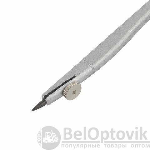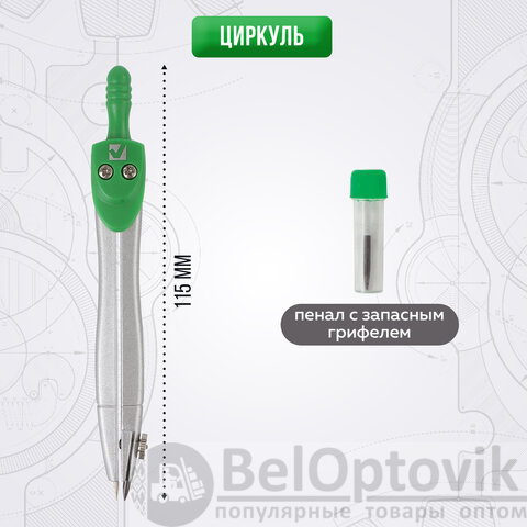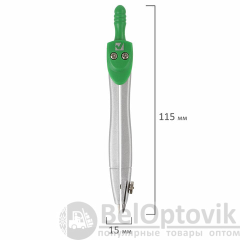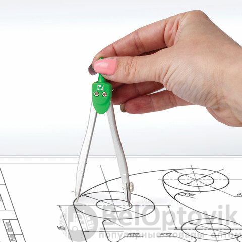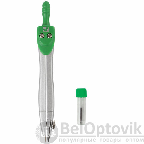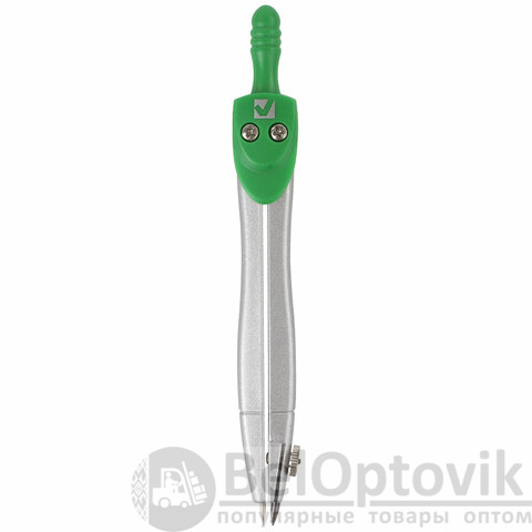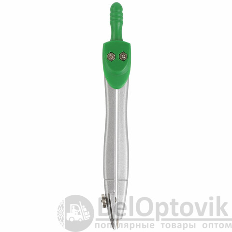 Циркуль длиной 115 мм имеет несгибаемые штанги. Изготовлен из металла, дополнительный цвет элементов – зеленый.