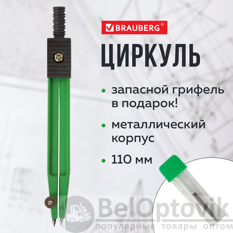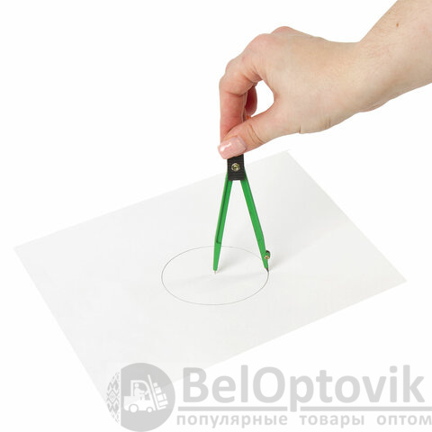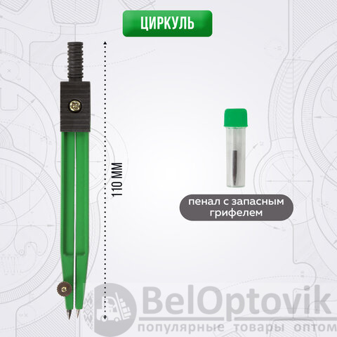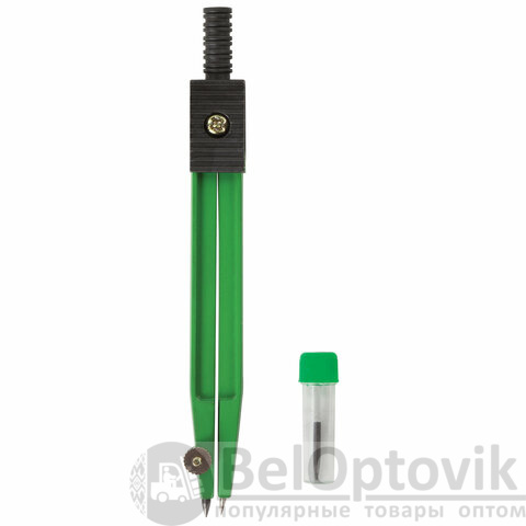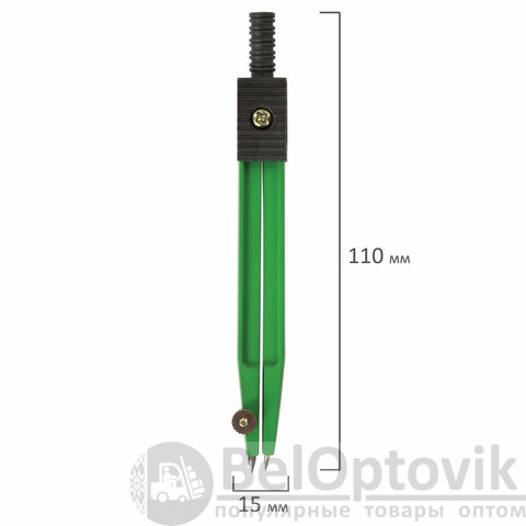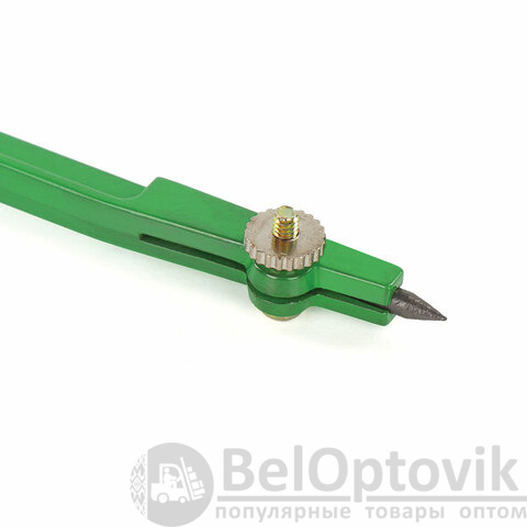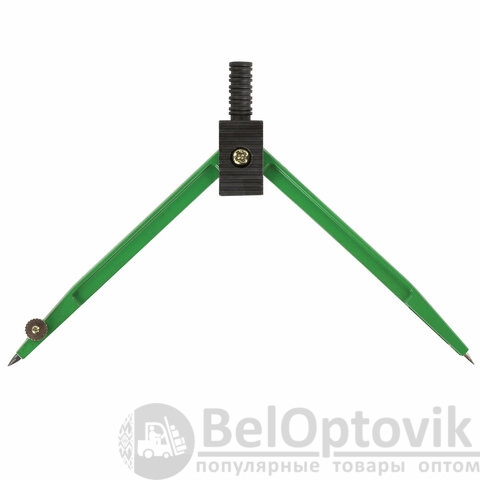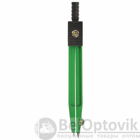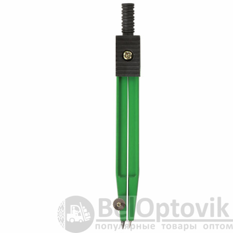 Циркуль длиной 110 мм имеет несгибаемые штанги и подстраиваемую иглу. Изготовлен из металла. Цвет - зеленый, дополнительный цвет элементов - черный.