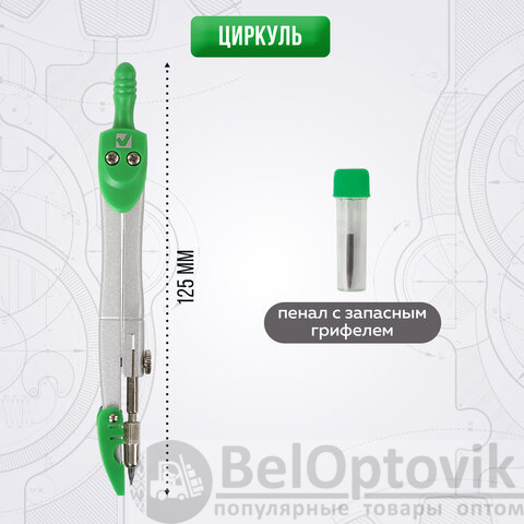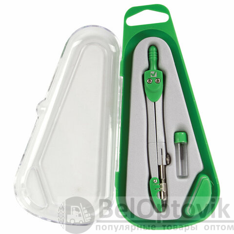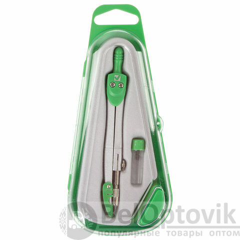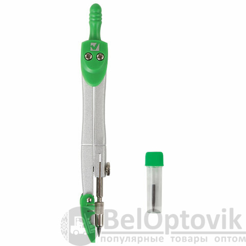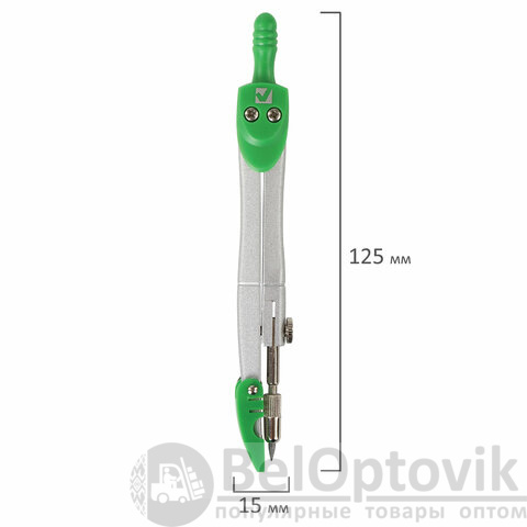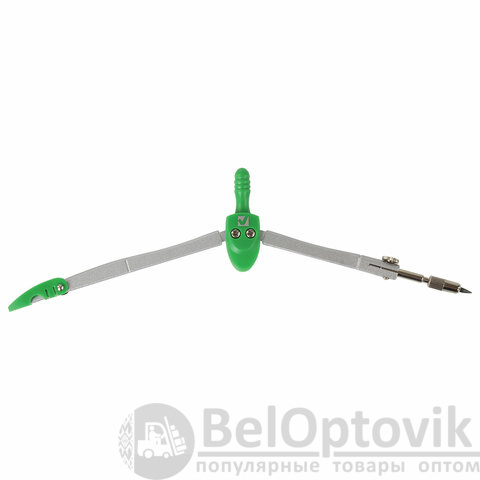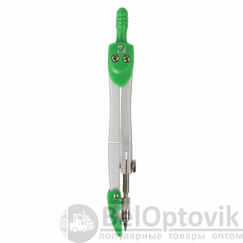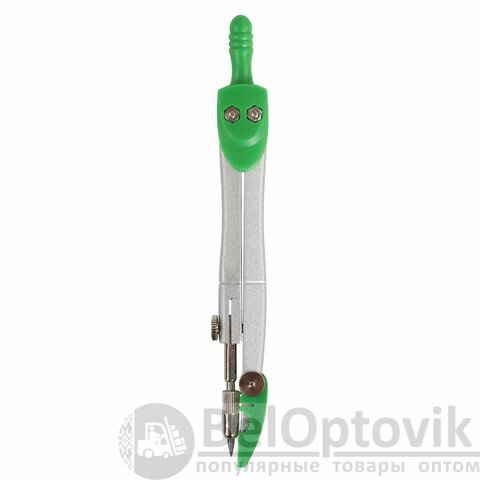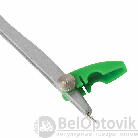 Циркуль длиной 125 мм имеет несгибаемые штанги и защитный колпачок для иглы. Изготовлен из металла, дополнительный цвет элементов – зеленый.