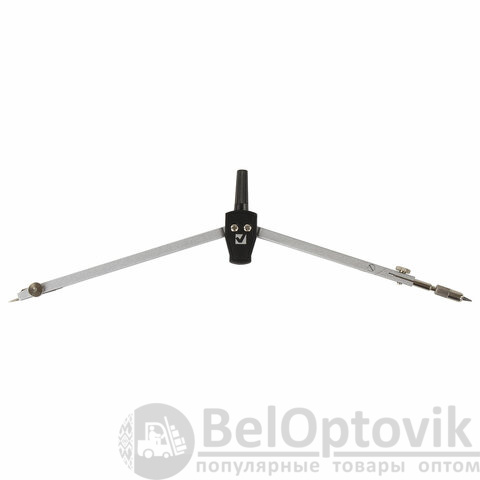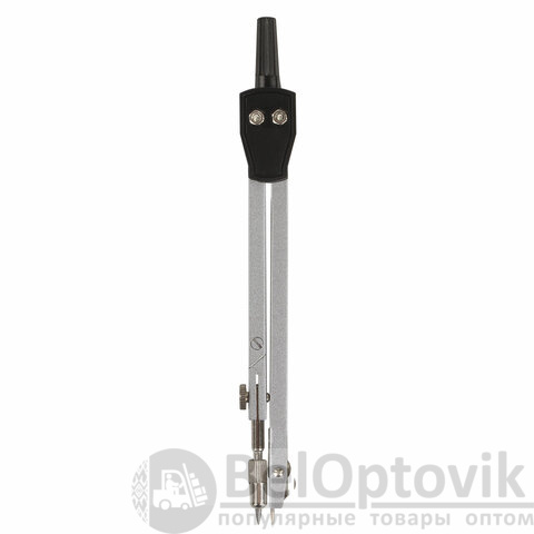 Циркуль длиной 140 мм имеет одну сгибаемую штангу и подстраиваемую иглу. Изготовлен из металла, дополнительный цвет элементов – черный.