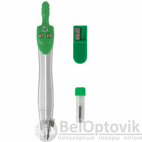 Циркуль длиной 115 мм имеет несгибаемые штанги. Изготовлен из металла, дополнительный цвет элементов – зеленый.