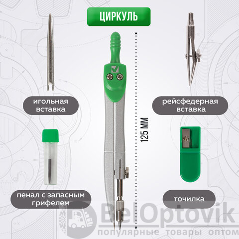 - Комплектация: игольная вставка, пенал с запасным грифелем, рейсфедерная вставка, точилка, циркуль