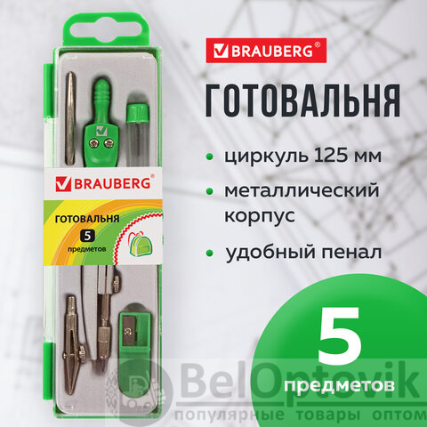 Металлическая готовальня BRAUBERG "Klasse" предназначена для выполнения чертежных работ. Для учеников младших и средних классов.