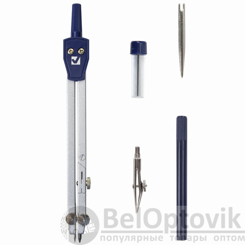 Циркуль длиной 140 мм имеет одну сгибаемую штангу и подстраиваемую иглу. Изготовлен из металла, дополнительный цвет элементов – синий.