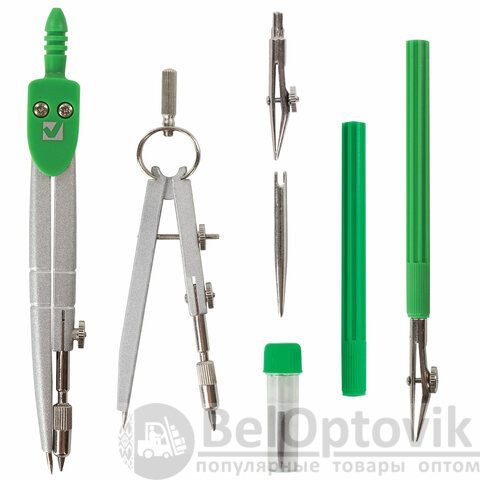 - Комплектация: держатель, игольная вставка, кронциркуль, пенал с запасным грифелем, рейсфедер, рейсфедерная вставка и держатель, циркуль