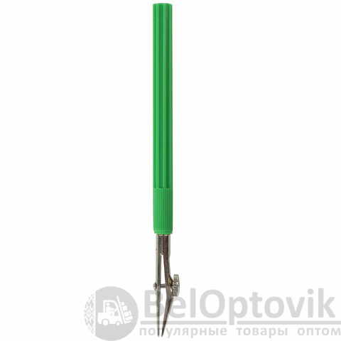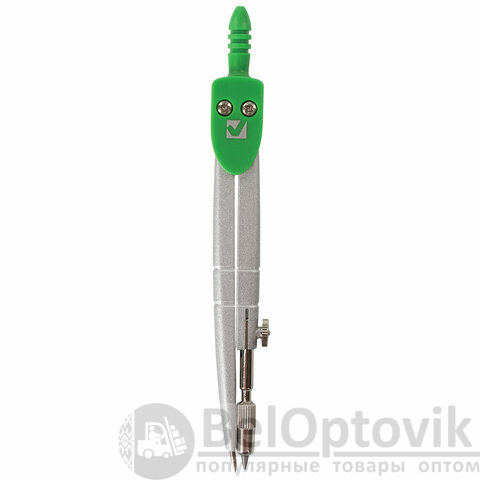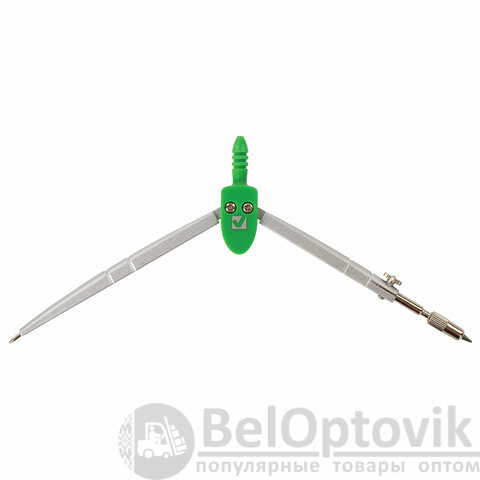 Циркуль длиной 120 мм имеет несгибаемые штанги. Изготовлен из металла, дополнительный цвет элементов – зеленый.