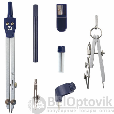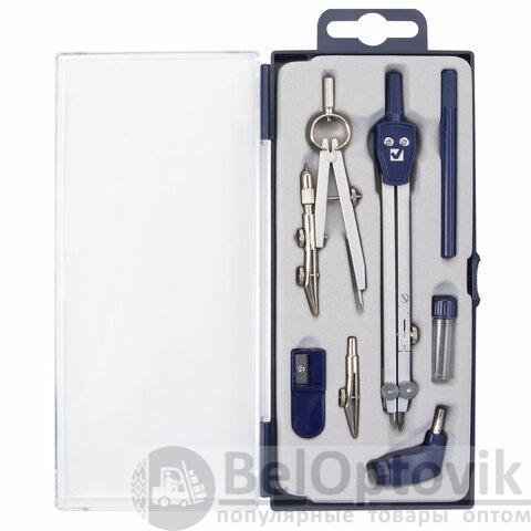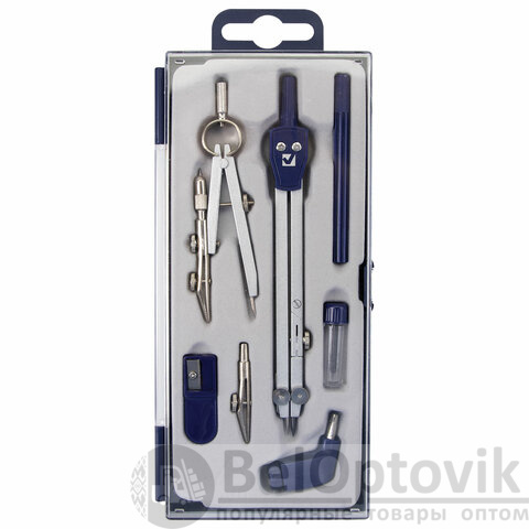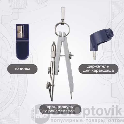- Комплектация: держатель, кронциркуль, пенал с запасным грифелем, рейсфедерная вставка и держатель, точилка, циркуль