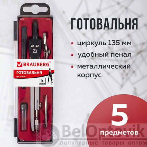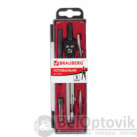Готовальня BRAUBERG "Architect", 5 предметов: циркуль 135 мм, 2 вставки, держатель, грифель, 210658