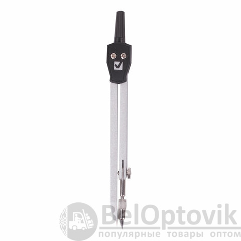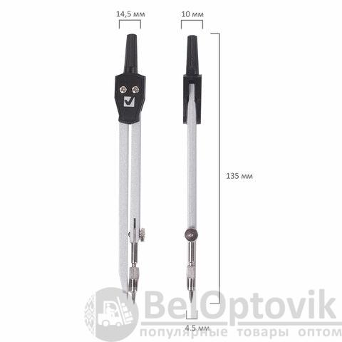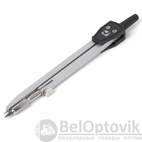 Циркуль длиной 135 мм имеет несгибаемые штанги. Изготовлен из металла, дополнительный цвет элементов - черный.