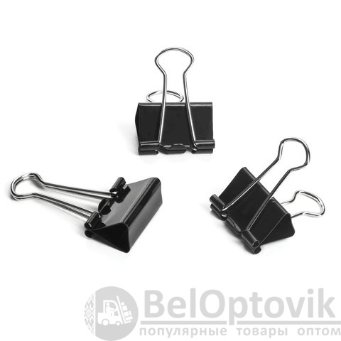 Изготовлены из стали с черным покрытием. Позволяют скреплять до 100 листов. Не деформируют бумагу. Ширина зажима - 25 мм. Поставляются по 12 штук в картонной коробке.