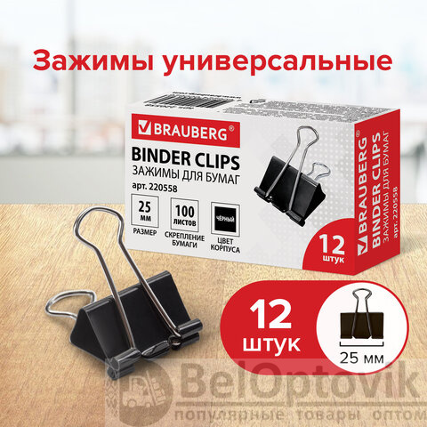 Зажимы для бумаг BRAUBERG, КОМПЛЕКТ 12 шт., 25 мм, на 100 листов, черные, картонная коробка, 220558