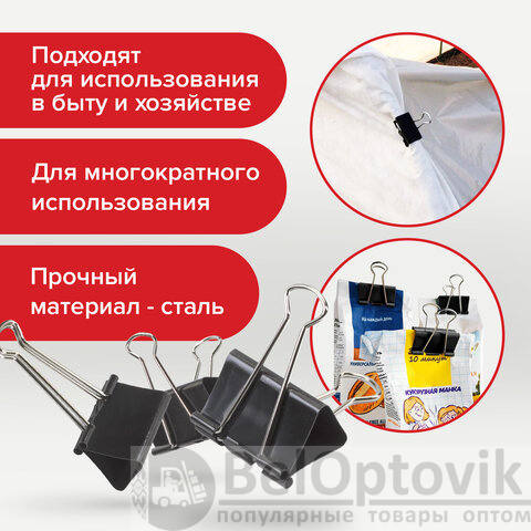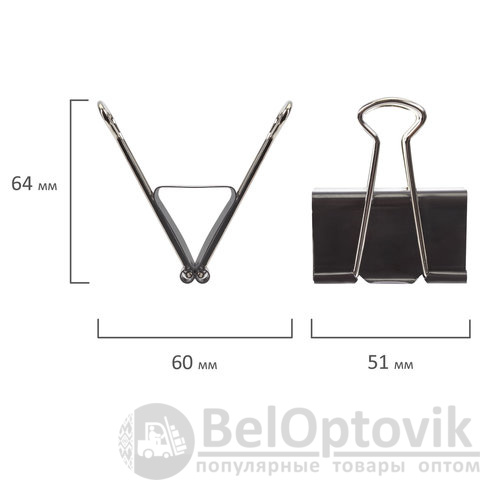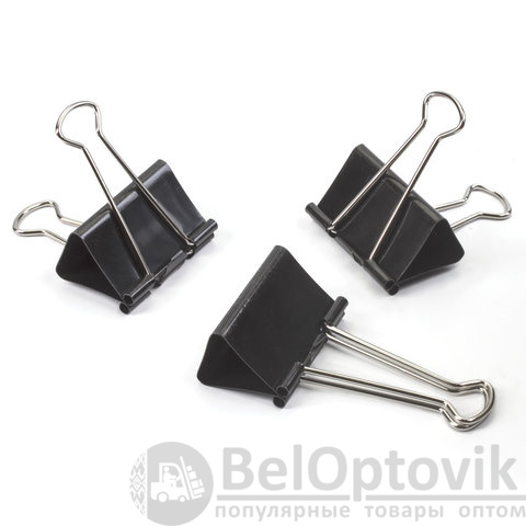 Изготовлены из стали с черным покрытием. Позволяют скреплять до 230 листов. Не деформируют бумагу. Ширина зажима - 51 мм. Поставляются по 12 штук в картонной коробке.
