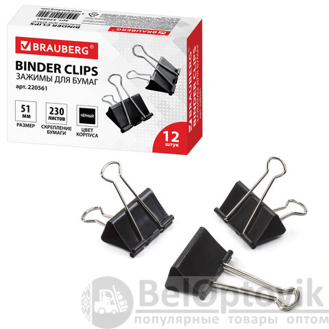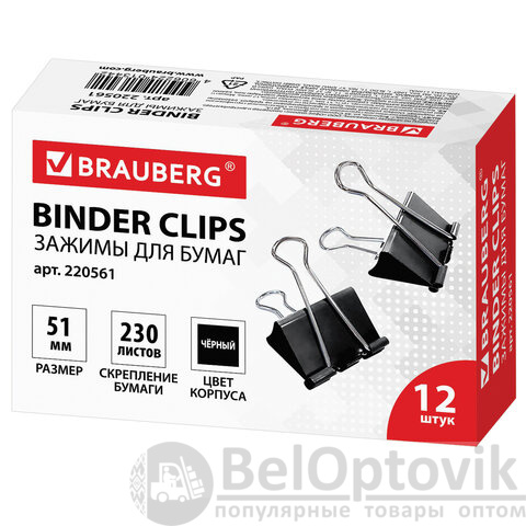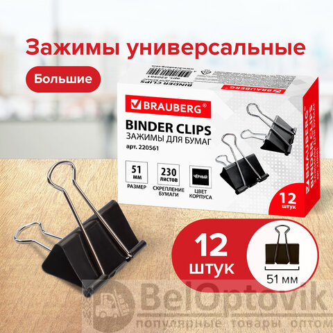Зажимы для бумаг большие BRAUBERG, КОМПЛЕКТ 12 шт., 51 мм, на 230 листов, черные, картонная коробка, 220561