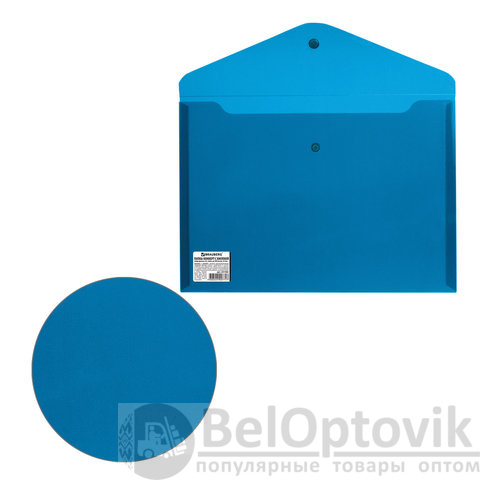 Папка-конверт с гладкой фактурой формата А4 изготовлена из плотного пластика синего цвета толщиной 200 мкм. Закрывается на защелку-кнопку, что делает удобным частое использование и обеспечивает быстрый доступ к ее содержимому. Папка способна вместить до 100 листов стандартной плотности.