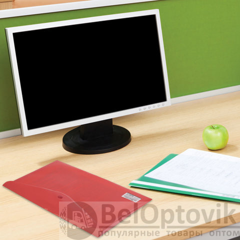 Папка-конверт с гладкой фактурой формата А4 изготовлена из плотного пластика красного цвета толщиной 200 мкм. Закрывается на защелку-кнопку, что делает удобным частое использование и обеспечивает быстрый доступ к ее содержимому. Папка способна вместить до 100 листов стандартной плотности.