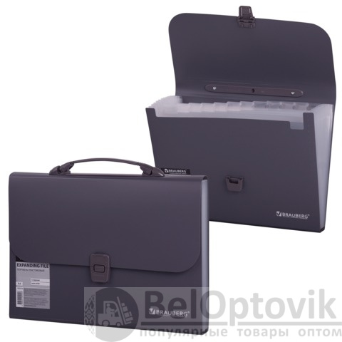 Портфель формата А4 (327х254х30 мм) изготовлен из плотного пластика стандартной фактуры толщиной 0,7 мм, выполнен в солидном темно-сером цвете и имеет 13 отделений с индексными ярлыками. Складная ручка обеспечивает компактность изделия. Портфель застегивается на клапан.