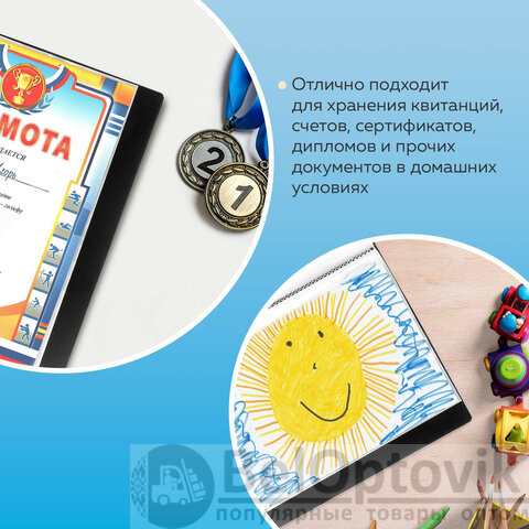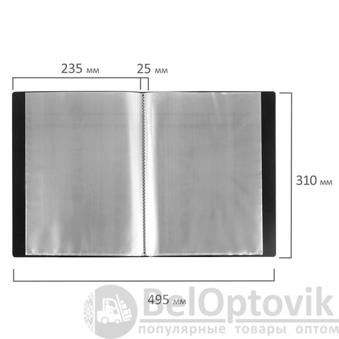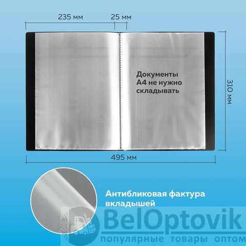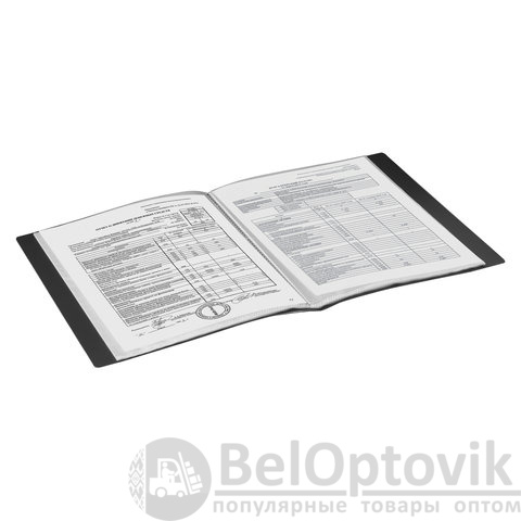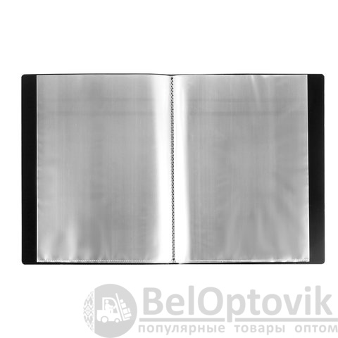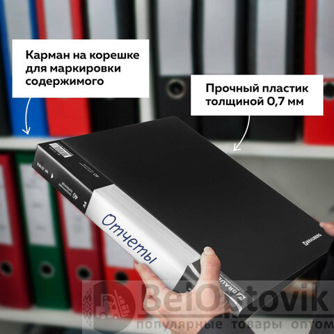 На корешке имеется карман для маркировки содержимого. Папка изготовлена из качественного пластика толщиной 0,7 мм с антибликовой фактурой, а ширина корешка составляет 25 мм. Содержит 40 вкладышей, позволяющих хранить документы формата А4 и обеспечивающих их надежную защиту от попадания влаги, пыли и прочих повреждений. Поставляется в индивидуальной упаковке.