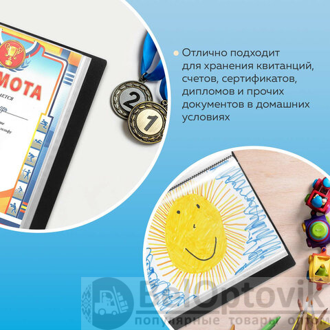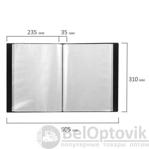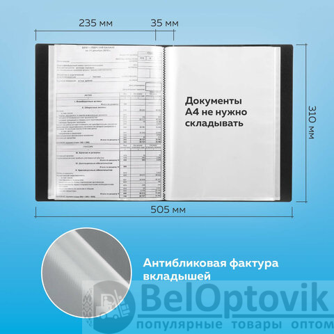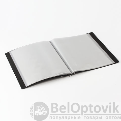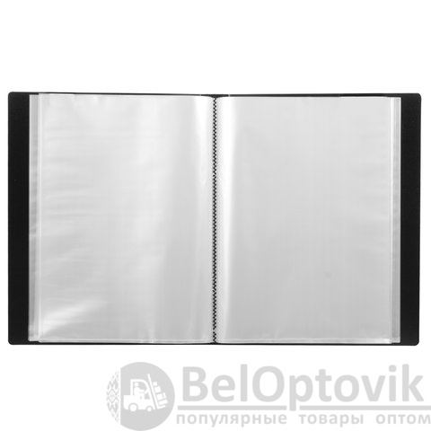 На корешке имеется карман для маркировки содержимого. Папка изготовлена из качественного пластика толщиной 0,9 мм с антибликовой фактурой, а ширина корешка составляет 35 мм. Содержит 80 вкладышей, позволяющих хранить документы формата А4 и обеспечивающих их надежную защиту от попадания влаги, пыли и прочих повреждений. Поставляется в индивидуальной упаковке.