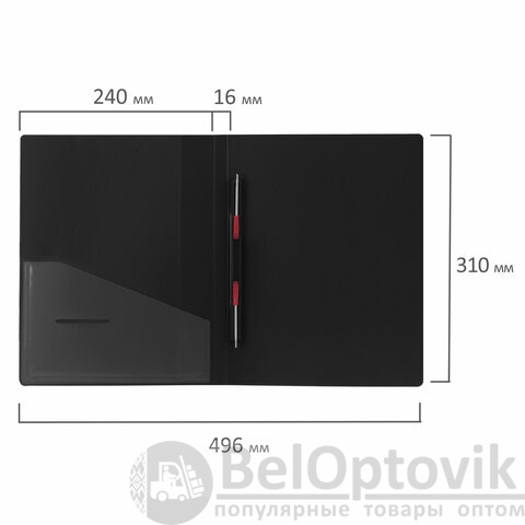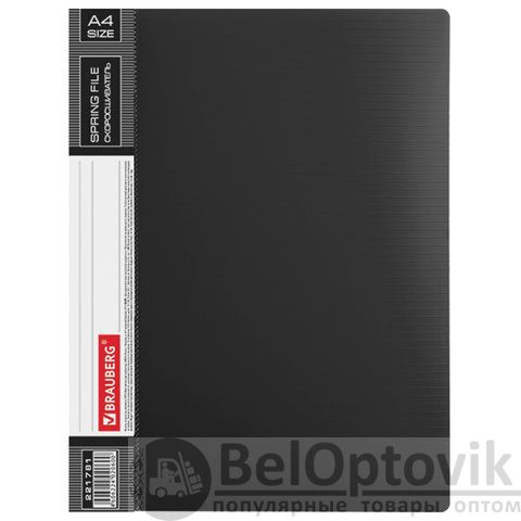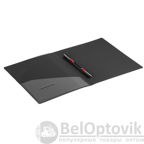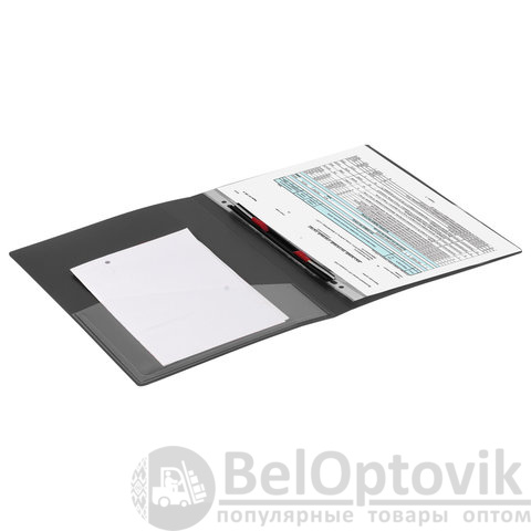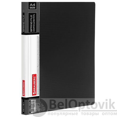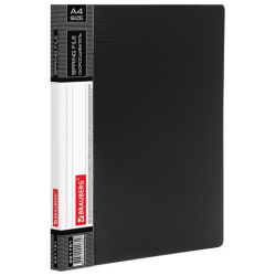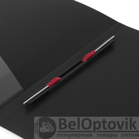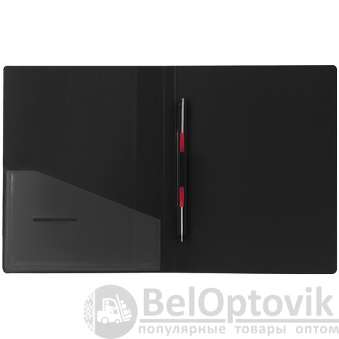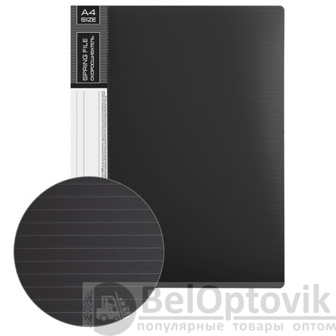 Изготовлена из высококачественного пластика черного цвета толщиной 0,7 мм с оригинальной линейной фактурой. Обеспечивает хранение до 100 листов формата А4. Металлический скоросшиватель с пружинным механизмом обеспечит надежную фиксацию документов. Кроме того, папка снабжена прозрачным внутренним карманом. Для идентификации имеется сменный бумажный корешок. Поставляется в индивидуальной упаковке.