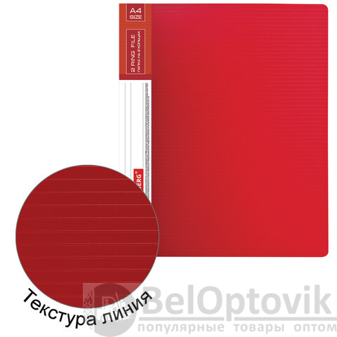Папка стандартного формата А4 вмещает до 270 листов. Изготовлена из пластика толщиной 0,9 мм с оригинальной линейной фактурой. Допускается влажная обработка поверхности. Внутренняя сторона обложки снабжена прозрачным карманом. Для идентификации имеется бумажный корешок. Ширина корешка составляет 35 мм. Папка оснащена двумя кольцами, которые обеспечивают надежное хранение документов. В неё можно вставить файлы или проколотые дыроколом листы и, при необходимости, заменить их на другие.
