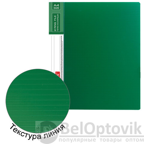 Папка стандартного формата А4 вмещает до 270 листов. Изготовлена из высококачественного полипропилена толщиной 0,9 мм с оригинальной линейной фактурой. Допускается влажная обработка поверхности. Внутренняя сторона обложки снабжена прозрачным карманом. Для идентификации имеется сменный бумажный корешок. Ширина корешка составляет 35 мм. Папка оснащена двумя кольцами, которые обеспечивают надежное хранение документов. В неё можно вставить файлы или проколотые дыроколом листы и, при необходимости, заменить их на другие. Каждая папка упакована в индивидуальный пакет.