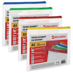 Папка-конверт на молнии МАЛОГО ФОРМАТА (240х175 мм), А5, молния ассорти, 0,15 мм, BRAUBERG "Smart", 221857