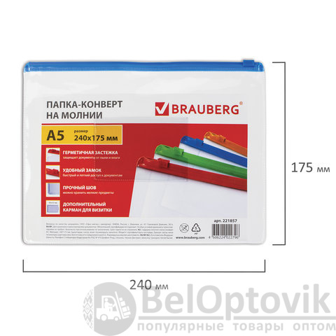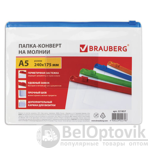 Папка-конверт на молнии BRAUBERG "Smart" идеально подойдет для хранения и транспортировки документов.