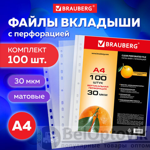 Папки-файлы перфорированные, А4, BRAUBERG "STANDARD", комплект 100 шт., матовые, 30 мкм, 221991