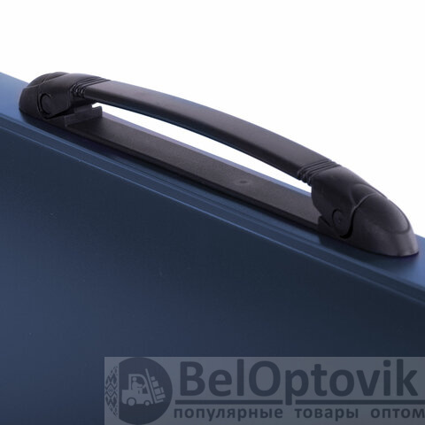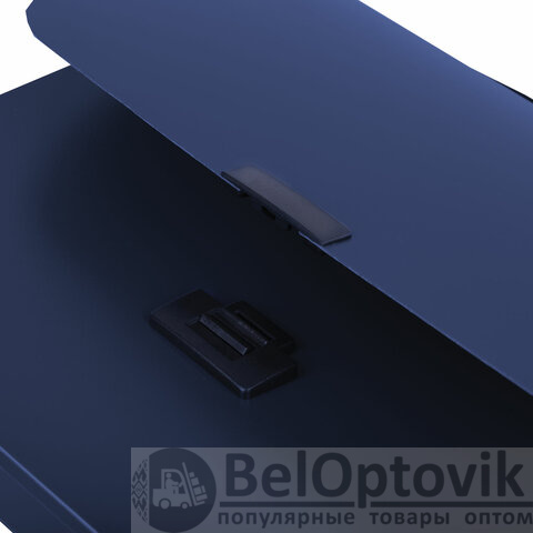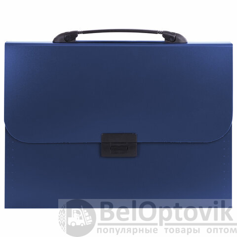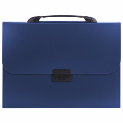 Портфель формата А4 (330х256х32 мм) изготовлен из плотного пластика стандартной фактуры толщиной 0,8 мм, выполнен в солидном синем цвете и имеет 7 отделений. Складная ручка обеспечивает компактность изделия. Портфель застегивается на клапан.