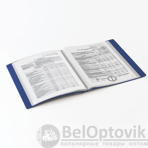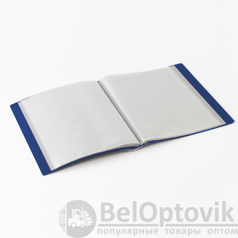 Для маркировки содержимого на корешок наклеена этикетка. Папка изготовлена из качественного пластика толщиной 0,8 мм с антибликовой фактурой, а ширина корешка составляет 35 мм. Содержит 80 вкладышей, позволяющих хранить документы формата А4 и обеспечивающих их надежную защиту от попадания влаги, пыли и прочих повреждений.