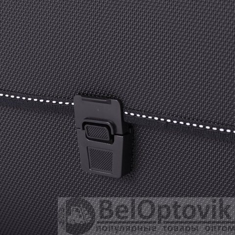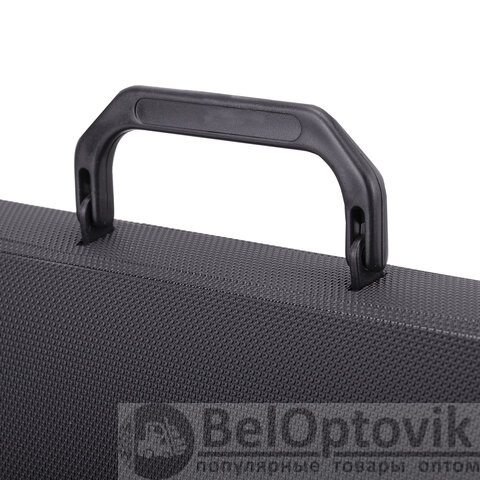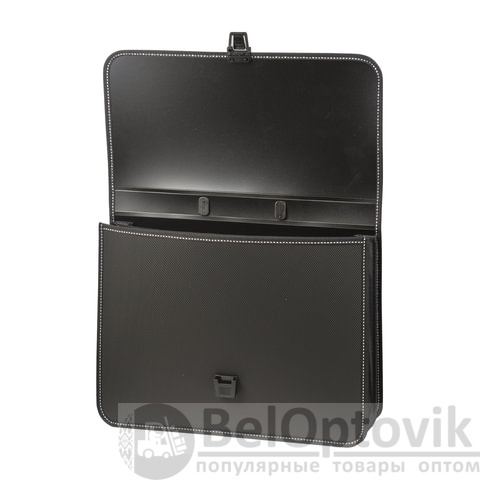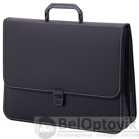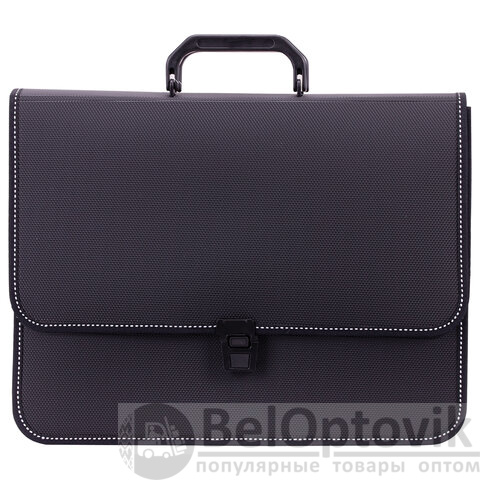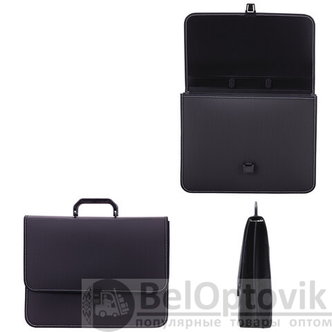 Портфель формата А4 (370х280х120 мм) изготовлен из плотного пластика толщиной 1 мм, выполнен в солидном черном цвете с фактурой "бисер" и имеет 2 отделения. Складная ручка обеспечивает компактность изделия. Портфель застегивается на клапан. Края окантованы тканью, что придает изделию презентабельный вид.