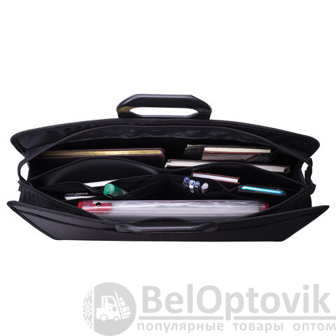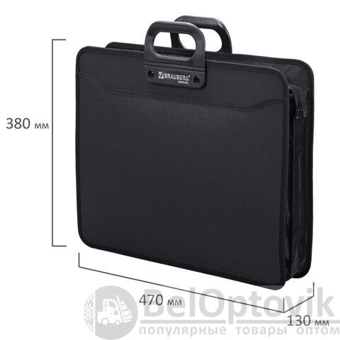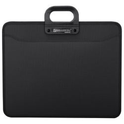 Портфель формата А3 (470х380х130 мм) изготовлен из плотного пластика толщиной 1 мм, выполнен в солидном черном цвете с фактурой "бисер" и имеет 3 отделения и 6 карманов. Гибкие ручки обеспечивают комфорт в процессе ношения. Портфель застегивается на молнию. Края окантованы тканью, что придает изделию презентабельный вид.
