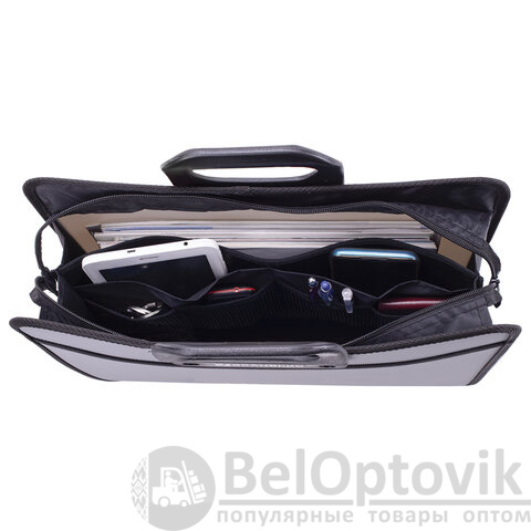 Портфель формата А4 (390х315х120 мм) изготовлен из плотного пластика толщиной 1 мм, выполнен в солидном сером цвете с фактурой "бисер" и имеет 3 отделения и 6 карманов. Усиленные ручки обеспечивают надежность в процессе эксплуатации. Портфель застегивается на молнию. Края окантованы тканью, что придает изделию презентабельный вид.