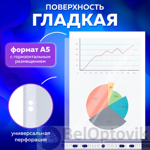 Перфопапки формата А5 с горизонтальным размещением содержат универсальную перфорацию, а также имеют гладкую поверхность и прочные швы. Толщина пленки – 35 мкм, что подходит для хранения до 20 листов в 1 папке-файле. В комплекте 100 шт.
