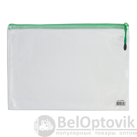 Изготовлена из прочного прозрачного пластика толщиной 220 мкм с сетчатой фактурой. Формат А4 (335х243 мм). Герметичная застежка-молния защищает документы от механических повреждений, а также пыли и влаги. Цвет молнии - ассорти (поставляется без возможности выбора).